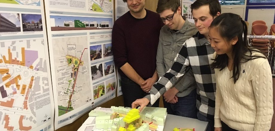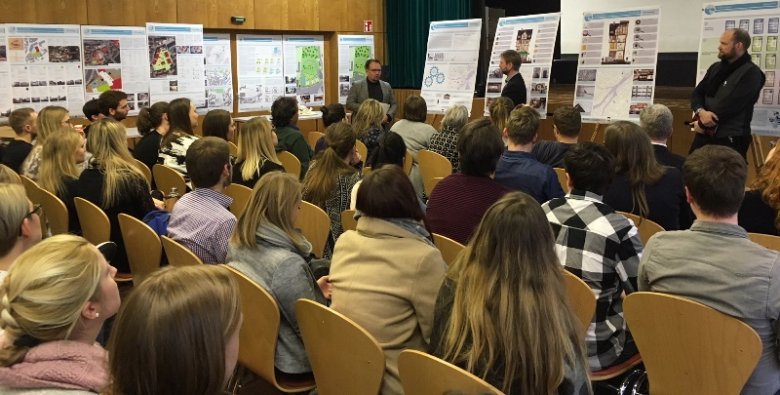 Foto unten: Bettino Gagliani (Stadtplanung Bad Kreuznach), Professor Dr.-Ing. Holger Schmidt (TU Kaiserslautern) und Dr.-Ing. Thomas Fischer (TU Kaiserslautern) bei der Abschlusspräsentation des Projekts vor den teilnehmenden Studierenden
