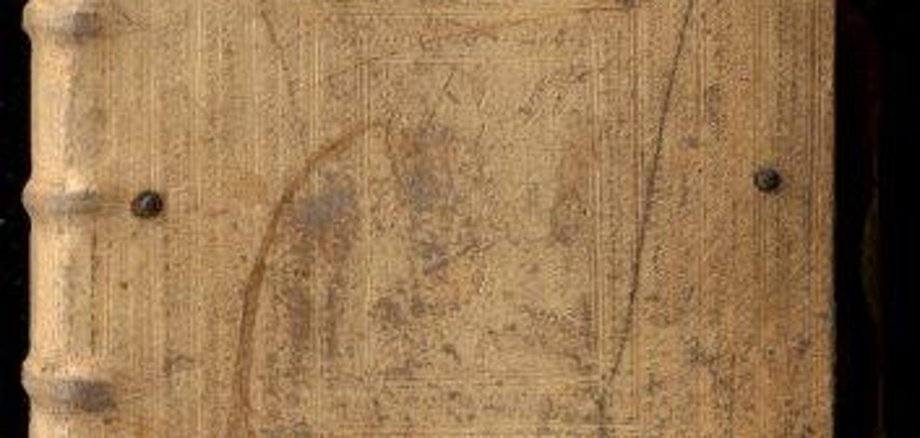 Das weiche Leder umhüllt das komplette Buch – inklusive Buchrücken. Zur Fixierung der Lederbespannung wurden mehrere Kupfernägel in den Holzdeckel geschlagen, wovon einige eine grünliche Patina tragen. Auf den Buchinnenseiten sorgen Fäden, die in regelmäßigem Abstand in das Leder eingenäht wurden, für eine gleichmäßige Verteilung der Spannung. Will man das Buch öffnen, muss man mit der Hand fest zwischen zwei Metallspangen schlagen, damit sich diese aus ihren Haken lösen um die bestehende Spannung aufzuheben – womit man das Buch aufschlägt.