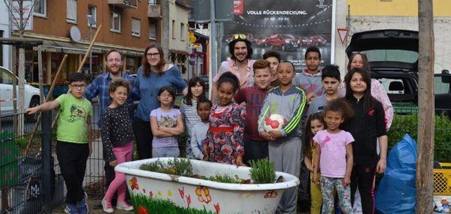 Foto: Beim Frühjahrsputz im Pocket-Park bepflanzen die AJKler und AJKlerinnen mit den Kindern im Stadtteil eine alte Badewanne als Hochbeet. Seit pflegen die Kinder und Anwohner das Beet und bedienen sich an den Kräutern. Auch im Kinderkochkurs vom AJK werden die geernteten Lebensmittel verwendet und die Kinder lernen, wo das Essen herkommt und wie man daraus leckere Speisen zubereiten kann.