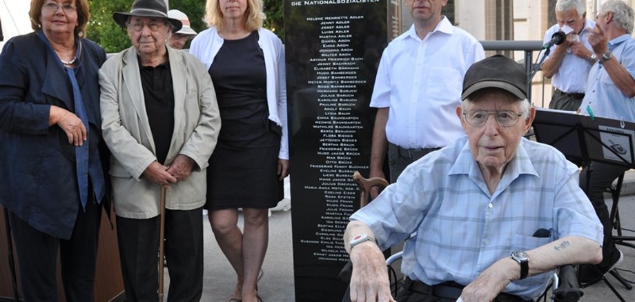 Foto: Helga Baumann, Nikolaus Blättermann, Heike Kaster-Meurer, Valeryan Ryvlin und Heinz Hesdörffer an der Namenstele, die in einer Feierstunde enthüllt wurde.