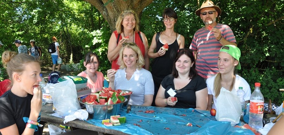 Foto oben: Im Schatten schmeckten die Melonen erfrischend: Oberbürgermeisterin Dr. Heike Kaster-Meurer hatte das Obst für den Ausflug des Feriendorfes auf das Freizeitgelände spendiert. Hinter ihr stehend: Katharina Becker (Abteilungsleiterin kulturelle Bildung), Danielle Schulz und Adrian Kroll (beide Leitung Kinderdorf).