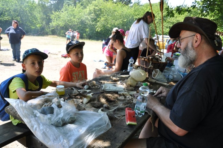 Das Motto der 66. Stadtranderholung lautet „Reise in die Steinzeit“. Marcus Rebensburg zeigte den Kindern, wie man mit Steinen Feuer macht. Er bastelte mit ihnen aus Holz Bumerangs oder aus Schienbeinknochen von Rehen Nadeln.