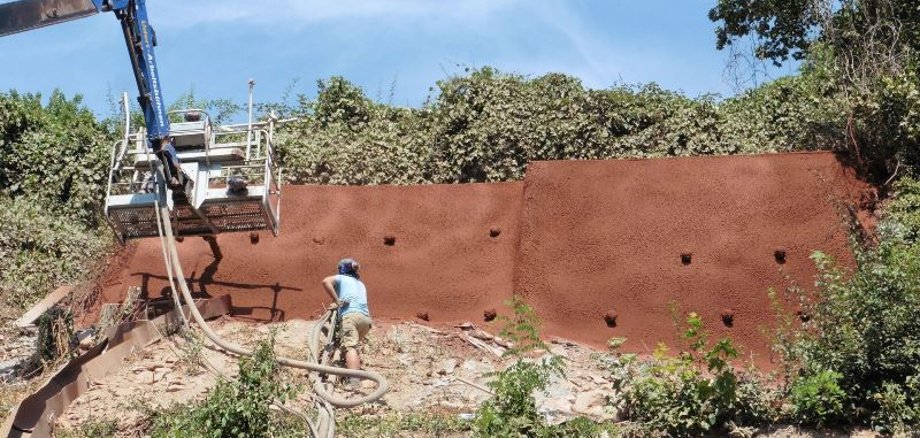 Die Firma Gudelj wurde beauftragt, diese Stützmauer zu sichern. Dazu wurden bis zu sieben Meter lange Anker in den Fels gebohrt, dann die Bewehrung eingebaut und gestern die Stützwand mit Spritzbeton hergestellt. Im Einsatz waren erfahrene Alpin-Arbeiter mit darauf spezialisierten Maschinen- und Geräten. Zum Abschluss wird nun der Arbeitsbereich gesäubert und in ein paar Wochen in diesem Bereich neu angepflanzt.