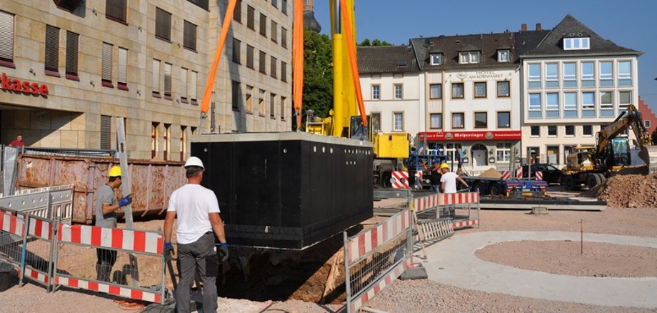 In der rund 30.000 Euro teuren Brunnenkammer ist ein Technikschacht für Pumpen, Steuerung und Filteranlagen. Außerdem befindet sich dort ein Wasserreservoir. Die Fertigteile für den eigentlichen Brunnen werden Anfang August eingebaut. Mit dem zügigen Baufortschritt sind Hans Sifft und Philipp Geib (Abteilung Tiefbau und Grünflächen) sehr zufrieden. Wenn es weiter so gut läuft, könnte die Platzneugestaltung des Kornmarktes bis Mitte Oktober abgeschlossen sein.