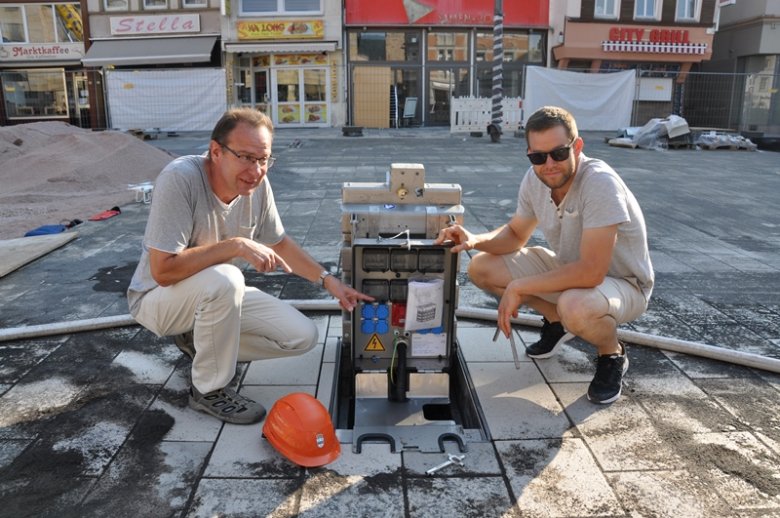 Foto unten: Beim Baustellentermin zeigten Hans Sifft (links) und Philipp Geib auch den versenkbaren „Unterstromversorgungspoller“. Auf dem Kornmarkt gibt es sechs dieser Poller, Stolperfallen durch Versorgungsleitungen gehören dann der Vergangenheit an.