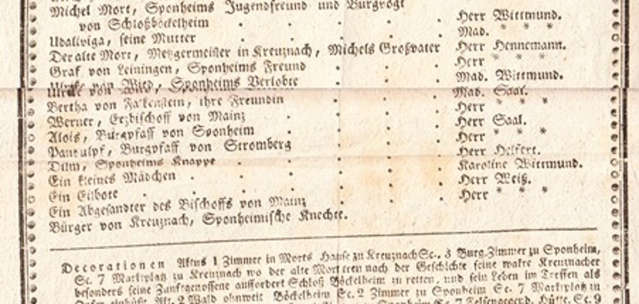 Der vorliegende Theaterzettel wirbt für das Stück „Michel Mort der Kreuznacher“, das als vaterländisches Trauerspiel angekündigt wird. Aufgeführt wurde es im Kreuznacher Theater am Sonntag, 15. März 1819 von einer „Schauspieler=Gesellschaft“, die unter der Leitung von J. Wittmund und D. Helfert stand. Der Verfasser des Theaterstücks, Friedrich Christian Henrich Laukhard (1757-1822), auch Magister Laukhard genannt, lebte zu diesem Zeitpunkt noch nicht lange in Kreuznach. Neben seiner Tätigkeit als Privatgelehrter fand der „ehemalige Professor der schönen Künste in Halle“ in der Stadt bis zu seinem Tod 1822 auch mit dem Schreiben von Schauspiel- und Theaterstücken sein Auskommen.