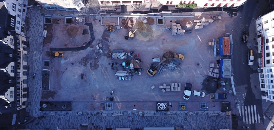 Wie auf dem Luftbild gut zu sehen, ist mittlerweile der zweite Bauabschnitt beim Kornmarkt (Bereich am ehemaligen Café Kiefer/Blücherhaus) fertiggestellt. Ursprünglich war der Termin für Mitte Juli geplant. Somit ist die Stadt weiter auf einem sehr guten Weg, den straffen Bauzeitenplan einzuhalten
