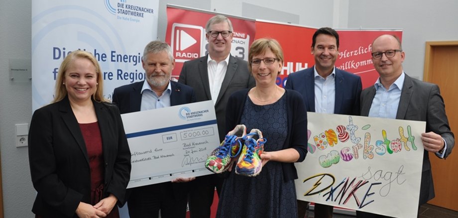 Foto, von links: Tammy Kühner (Assistenz der Geschäftsführung Antenne Bad Kreuznach), Dietmar Canis (Geschäftsführer Stadtwerke), Bürgermeister Wolfgang Heinrich, Renate Ziegler (Vorsitzende Kunstwerkstatt Bad Kreuznach), Jörg Brendel (Vertriebsdirektor Sparkasse Rhein-Nahe), Andreas Kolb (Geschäftsführer Frank Schuhe+Sport).