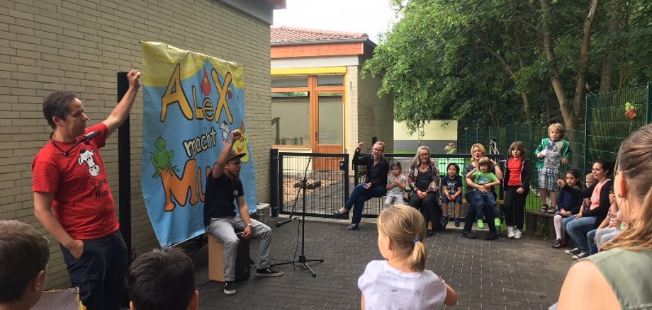 Foto: Alex Schmeisser („Alex macht Musik“) und Kita-Leiter Eugen Kaiser (Mitte, sitzend) wissen, wie sie Kinder unterhalten.