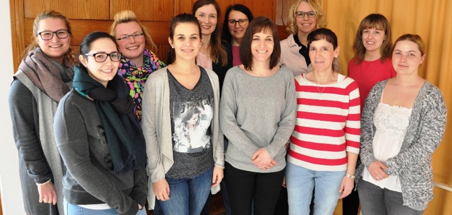 Hinten: Marisa Rauls (Personalabteilung), Eva-Maria Hellig, Julia Esters (Pädagogische Mitarbeiterin Kindertagesbetreuung), Daniela Ehlert, OB Heike Kaster-Meurer, Desiree Kundke