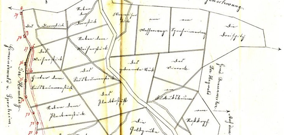 Die Karte wurde im Maßstab 1:10.000 aufgenommen. Neben der rot markierten Wege- und Grenzführung und den Grenzsteinen, sind unter anderem die Namen der Schläge des ehemaligen Kreuznacher Stadtwaldes Gauchsberg verzeichnet.