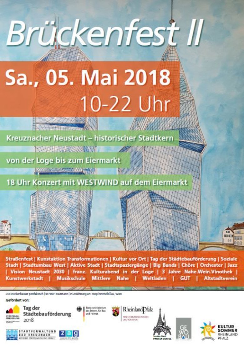Das Brückenfest wird unterstützt vom Kultursommer Rheinland-Pfalz, von der Städtebauförderung von Bund, Ländern und Gemeinden, vom Bundesministerium des Innern, für Bau und Heimat, vom Ministerium des Innern und für Sport Rheinland-Pfalz, von Pro City Bad Kreuznach und der Gewobau.