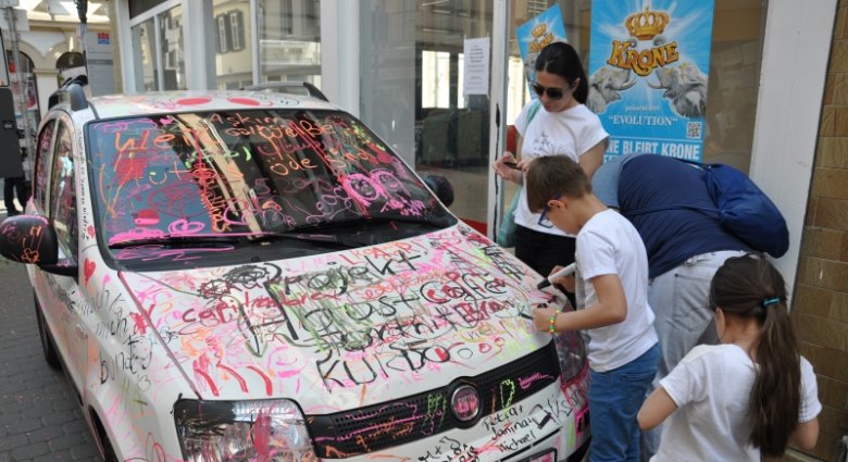 Mit bunter und abwaschbarer Kreide durfte der Dienstwagen der Initiative „Jugend-, Projekt- und Viertelarbeit“ in der Neustadt bemalt werden.