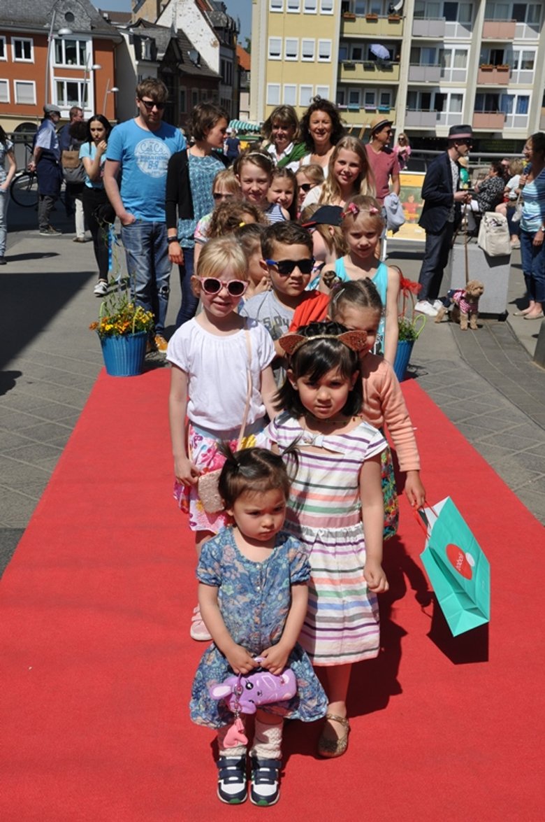 Junge Models auf dem roten Teppich. Modenschau bei der "Glücksmaus"
