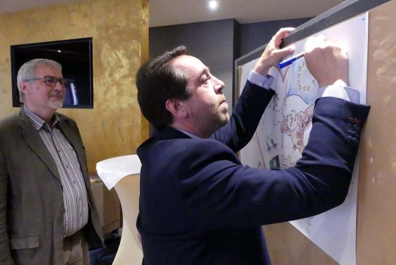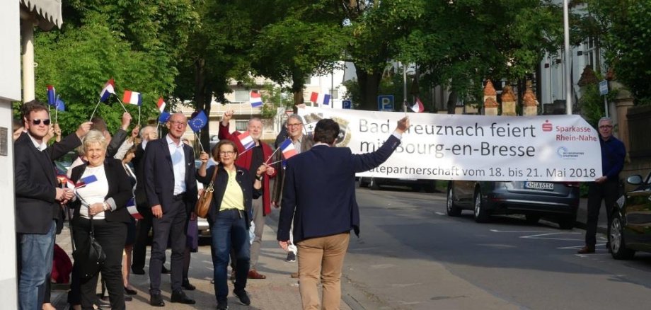 Foto unten: Partnerschaft mit Herz. Das Plakat trägt viele Unterschriften, auch die von Giullaume Lacroix, dem Bourger Beigeordneten für Internationale Beziehungen. Links Arne Krohn (Neuruppin)