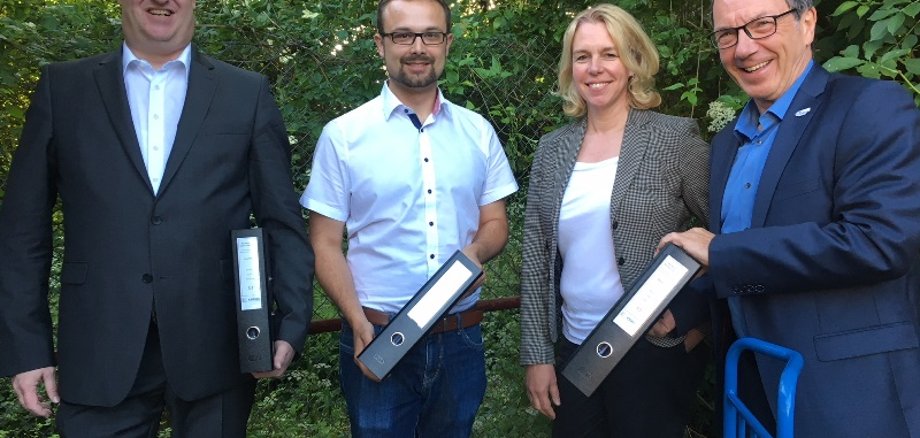 Foto, v.l.: Bürgermeister Wolfgang Heinrich (Aufsichtsratsvorsitzender der Badgesellschaft), Benedikt Blanz (Abteilungsleiter Bauverwaltung), OB Dr. Heike Kaster-Meurer und Klaus-Dieter Dreesbach (stellvertretender Geschäftsführer Badgesellschaft) freuen sich über die Fortschritte beim Salinenbad.
