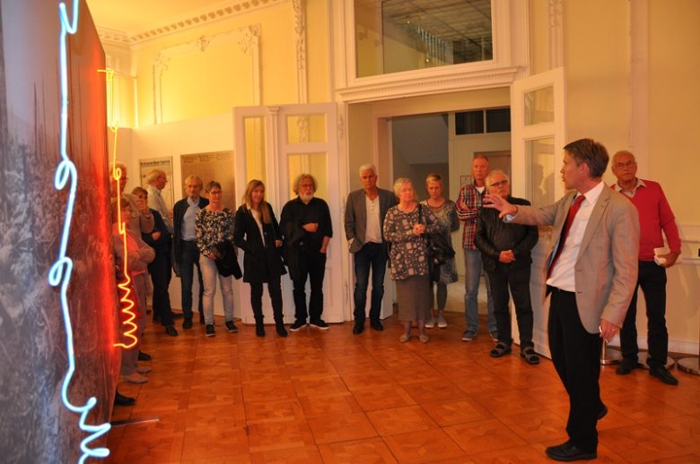 Foto unten: Marco van Bel erläutert den Besuchern der Vernissage das Konzept der Kunst Koevoets'.