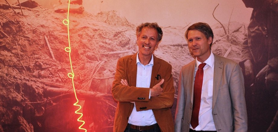 Foto oben: Künstler Geert Koevoets mit Museumsleiter Marco van Bel vor einem der ausgestellten Werke