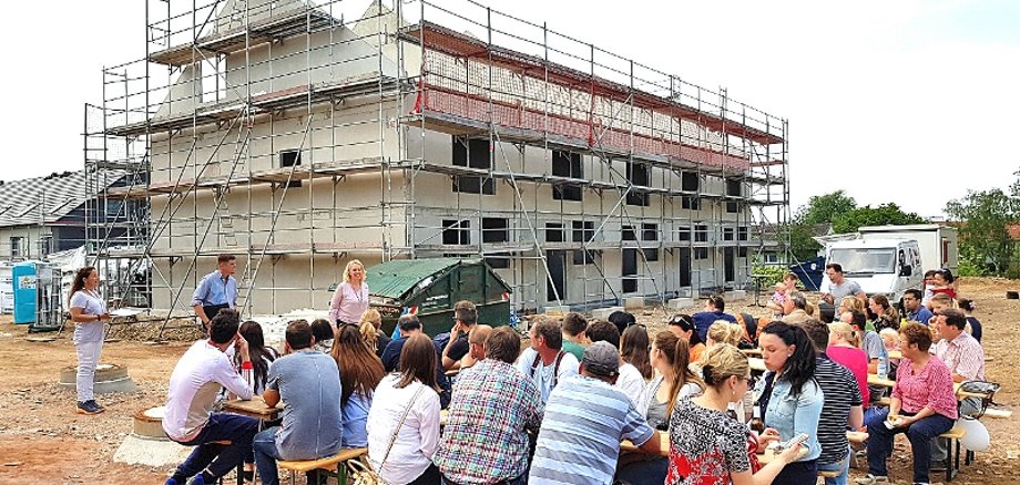 Die 31 Reihenhäuser werden in industrieller Serienbauweise hergestellt und können daher vergleichsweise preiswert angeboten werden. Vom Haus „120 m² Wohntraum“ werden sechs Exemplare errichtet, die Preise starten bei 199.990 Euro. Der Startpreis für eines der 25 Häuser „145 m² Familienglück“ beginnt bei 219.990 Euro. Mehr als die Hälfte der Häuser sind bereits verkauft, berichtete Miriam Nordmann, die bei der Deutschen Reihenhaus AG für den Vertrieb zuständig ist. Mit der Fertigstellung der Häuser liege man im Zeitplan, ergänzte Bauleiter Christian Weber. Durch den traditionellen Richtspruch des Zimmermanns, der ein Trinkglas auf dem Boden zerschellte, wurde dem gesamten Projekt symbolisch das Glück gesichert.