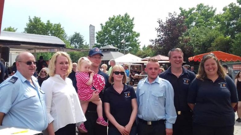 Foto unten, v.l.: Karl-Werner Gaul (stellv. Wehrleiter), OB Dr. Heike Kaster-Meurer, Christian Weitzmann mit seiner Tochter Jule, Sabrina Weitzmann, Lars Dillenberger, Sascha Elstner, Karin Braun