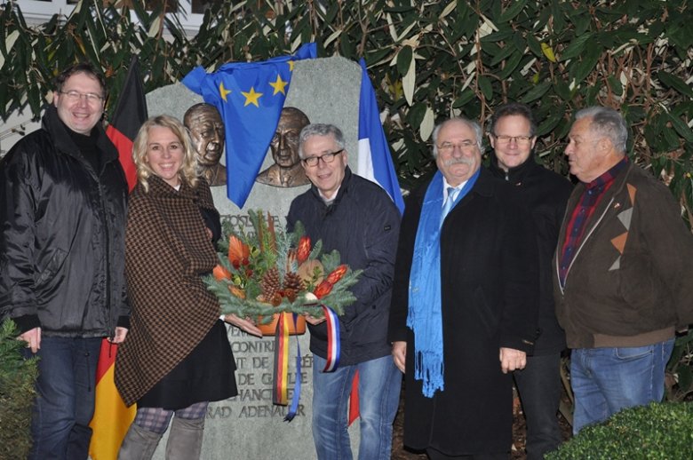 Foto mitte: Gemeinsam mit Oberbürgermeisterin Dr. Heike Kaster-Meurer und Gérard Lora-Tonet (3.v.r) legten der Präsident der deutsch-französischen Gesellschaft Bad Kreuznach, Michel Kopp (3.v.l.) und sein Vize Christian Schneider (2.v.r.) einen Kranz am Gedenkstein zum Treffen Konrad Adenauer und Charles des Gaulle (am 26. November 1958) vor dem Kurhaus nieder.