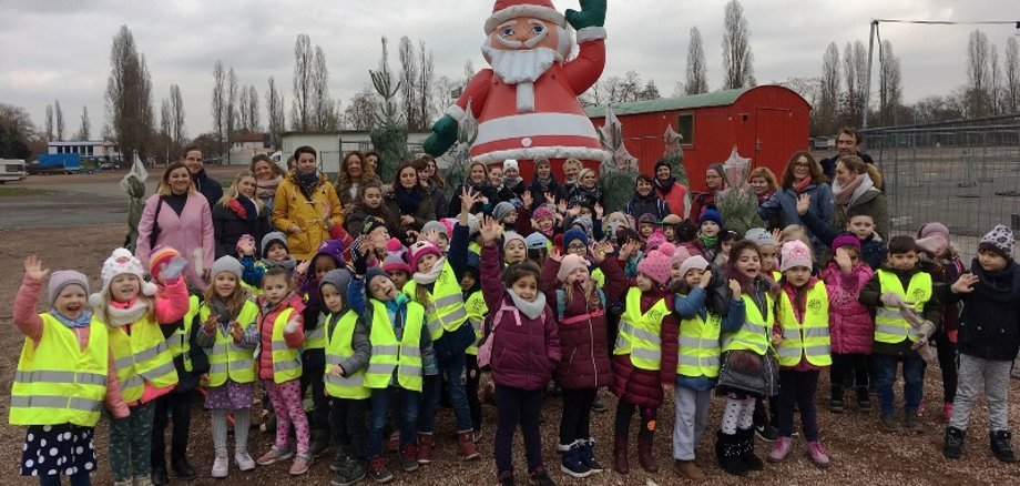 Foto: Die Kinder und Erzieher der Kreuznacher Kitas freuen über die Weihnachtsbaumspende des Fortbetriebs Zimmermann.