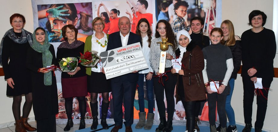 Foto: Die Kunstwerkstatt Bad Kreuznach um Leiterin Renate Ziegler (4. von links) freut sich bei der Preisverleihung in Koblenz mit den Kindern und Jugendlichen über den ersten Preis. © Seydel