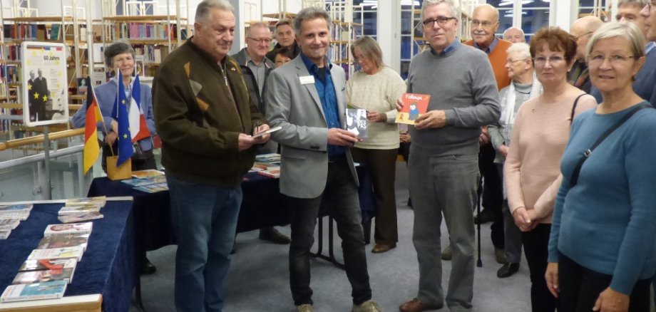 Foto: Zwei Tische voller neuer französischer Bücher, v.l.: Norbert Schneider (Ehrenmitglied der Deutsch-Französischen Gesellschaft Bad Kreuznach), Stefan Meisel (Leiter der Stadtbibliothek), Michel Kopp (Präsident der Deutsch-Französischen Gesellschaft), Katrin Prinski (Vorstandsmitglied Deutsch-Französische Gesellschaft).
