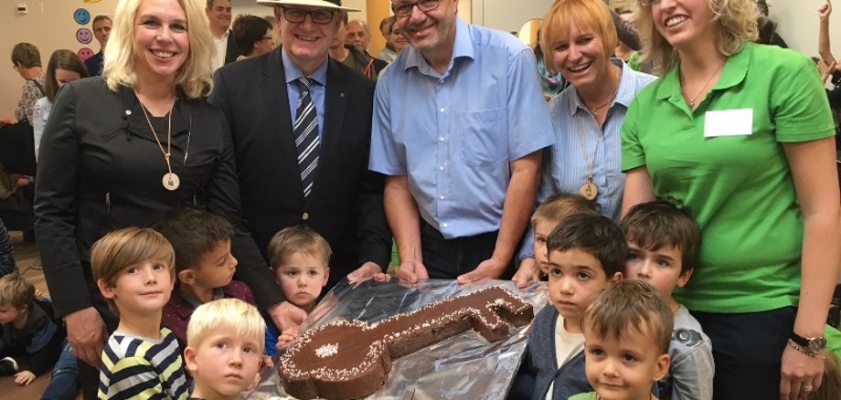 Foto: Die Kinder der Kita Pappelweg hatten einen Kuchen in Form eines Schlüssels gebacken, mit dem die feierliche Übergabe der neuen Einrichtung von der Gewobau an die Stadt erfolgte.