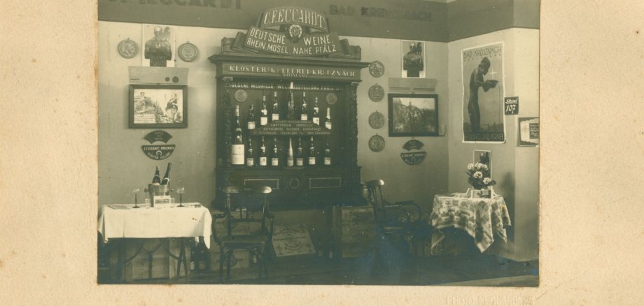 Wie zufällig lenkt der Aufbau des Standes den Blick in eine Ecke, in der sich die Stadt des Naheweins auch als Kurstadt und Heilbad werbewirksam darstellt − mit modernem Auftritt über einprägsame, grafisch zeitgemäße Poster und Flyer, die um 1927 gestaltet wurden. Über das Produkt Wein verbindet Eccardt Internationales, Nationales, Regionales und Lokales miteinander. Der Stand wirkt wie die Inszenierung eines bürgerlichen Weinlokals vor 1914.