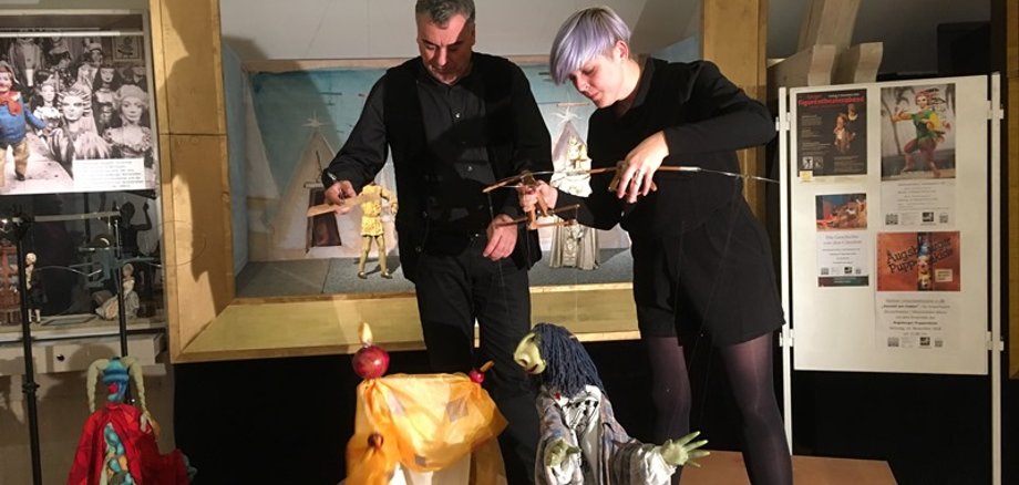 Foto: Die US-amerikanische Marionettenspielerin Sarah Frechette (mit Museumleiter Markus Dorner) gab am Montag bereits einen kurzen Einblick in ihren Festivalbeitrag.