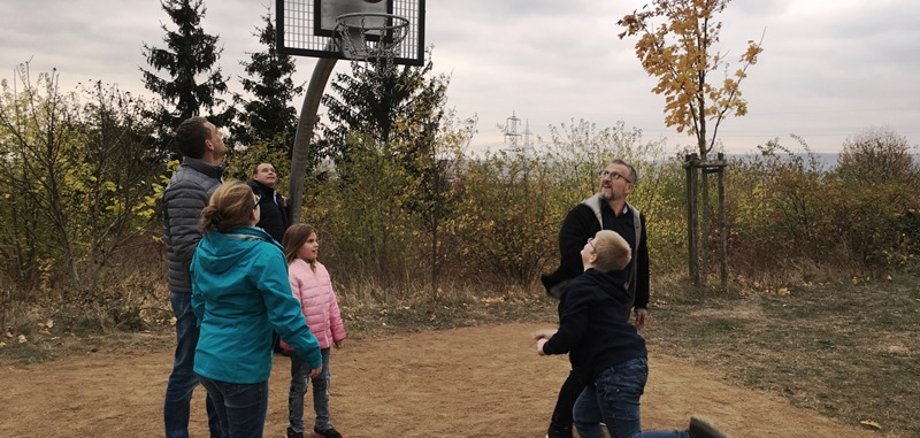 Foto: Treffer eines kleinen Basketballers, v. l.: Ortsvorsteher Mirko Kohl, Elisabeth Nonnenbroich (Betreuerin vom ÖKJH), Ortsbeiratsmitglied Manfred Schulze und Adrian Kroll (Jugendzentrum „Die Mühle“) mit Kindern bei der Einweihung des neuen Basketballkorbs.