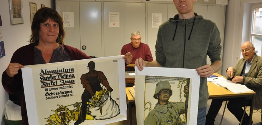Foto: Plakate aus dem Stadtarchiv sind bei einer Veranstaltung zum Ende des Ersten Weltkrieges (11.11.1918) im Freilichtmuseum Bad Sobernheim zu sehen. Franziska Blum-Gabelmann konnte Niels Ungruhe interessantes Material zur Verfügung stellen.