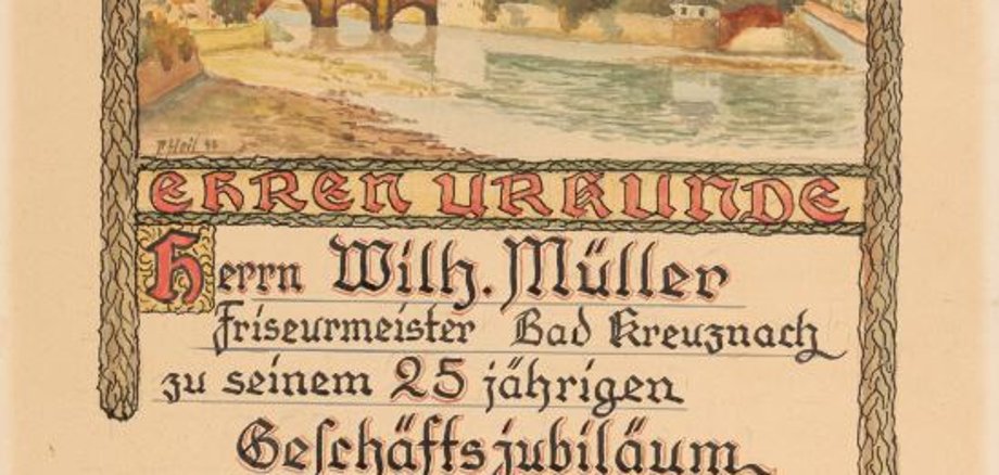 Im Namen der Friseurinnung des Kreises Kreuznach verlieh der Obermeister der Innung, Philipp Leonhard, dem Friseurmeister Wilhelm Jacob Müller (1892-1961) am 6. September 1944 eine Ehrenurkunde zu dessen 25-jährigem Geschäftsjubiläum.
