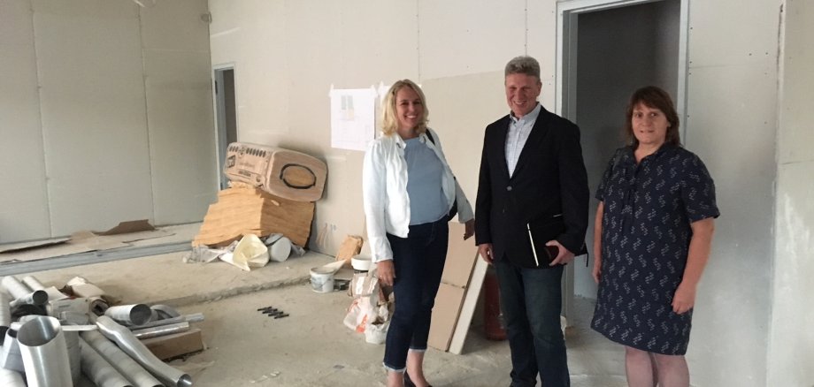 Foto, v.l.: Oberbürgermeisterin Dr. Heike Kaster-Meurer, Bauamtsleiter Klaus Christ und Stadtarchivleiterin Franziska Blum-Gabelmann auf der Baustelle des Hauses der Stadtgeschichte.