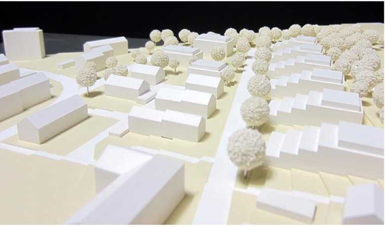 Foto unten: Bis zu 250 Wohnungen könnten bei dem Bauvorhaben an der Humperdinckstraße und der Hohe Bell am südöstlichen Rand der Stadt entstehen. Bei dem Bild handelt es sich um ein Modell des beauftragten Planungsbüros. © DJL Architekten