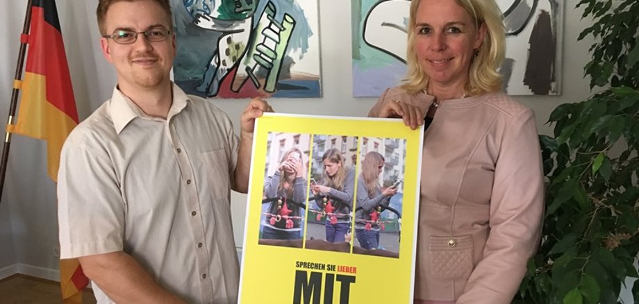 Foto oben: Hoffen viele Eltern mit der Aktion zu erreichen: OB Dr. Heike Kaster-Meurer und Projektleiter Christopher Karras vom Stadtjugendamt.