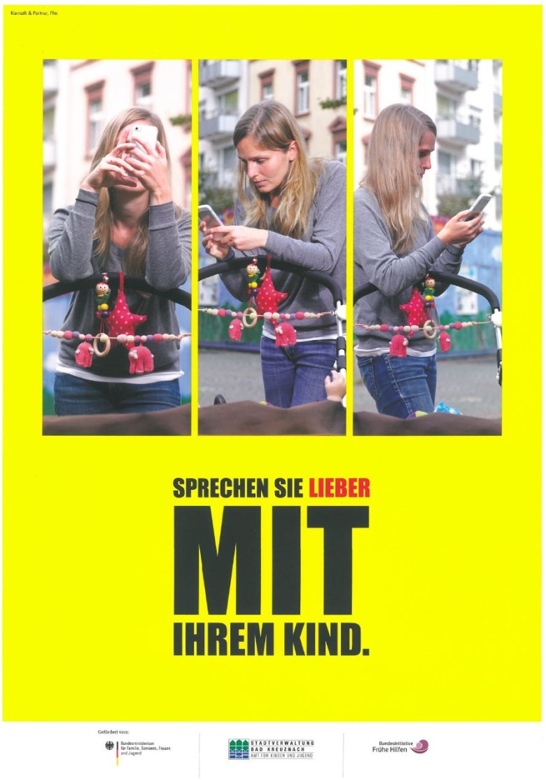 Die Plakate und Postkarten in der Signalfarbe Gelb mit den markanten Fotos einer vom Smartphone abgelenkten Mutter machen ab dieser Woche in der Stadt auf die Aktion aufmerksam. Rund 60 Netzwerkpartner − Träger der Jugendhilfe, Beratungsstellen, Kitas, die Kreuznacher Diakonie und weitere Institutionen − beteiligen sich an der Kampagne. Oberbürgermeisterin Dr. Heike Kaster-Meurer: „Ich freue mich, dass so viele Akteure aus Bad Kreuznach die Kampagne unterstützen, indem sie die Plakate aushängen und die Postkarten in ihren Räumlichkeiten auslegen.“ Es sei essentiell, dass Eltern mit ihren Kindern kommunizierten, andernfalls könne es zu einer Verzögerung der Sprachentwicklung kommen, weist Kaster-Meurer auf die möglichen Folgen des unbedachten Tuns der Eltern hin.