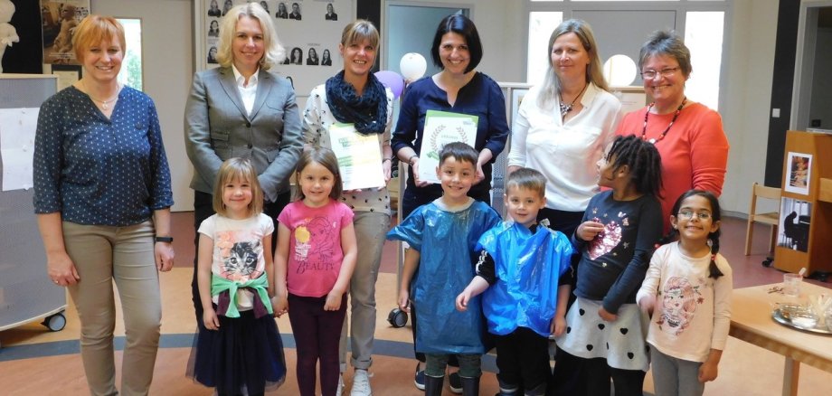 Foto, v.l.: Freuen sich über die Zertifizierung der Kita Hermann-Rohloff: Jugendamtsleiterin Sabine Raab-Zell, Oberbürgermeisterin Dr. Heike Kaster-Meurer, Stephanie Walheim (Erzieherin im Forschungsraum), Kita-Leiterin Irina Söntgerath, Hanna Reschke (Jugendamt) und Daniele Darmstadt (Kreisvolkshochschule Mainz-Bingen).