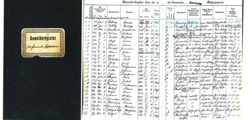 „Das Anmelderegister über die in die Gemeinde Ippesheim Eingezogenen“ wurde vom 3. Juni 1919 bis 30. Mai 1969 von der Ortsgemeinde Ippesheim geführt. Der erste Eintrag vom 3. Juni 1919 in das schwarz umschlagene und geheftete Buch bezieht sich auf den Zuzug der aus Gutenberg stammenden Maria Colling, der letzte vom 30. Mai 1969 auf Jutta L. aus Bingen.