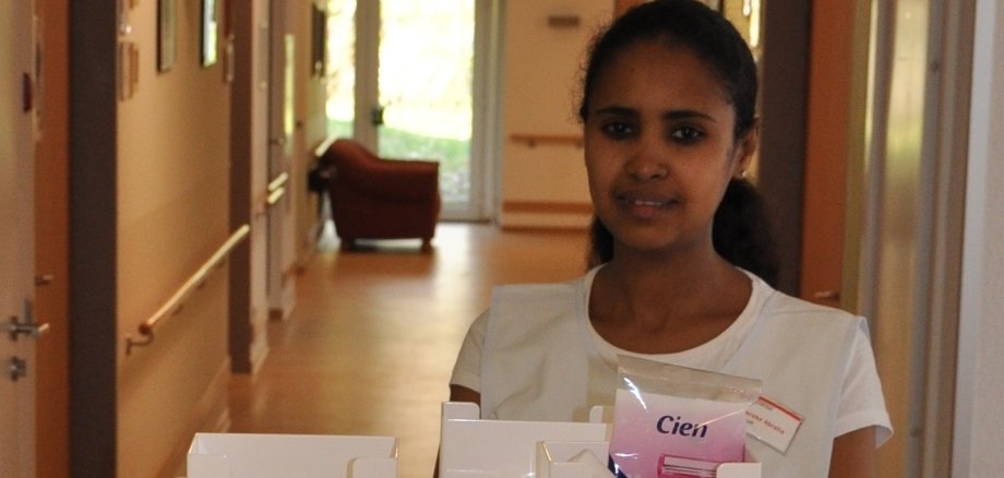 Dort in der Flüchtlingsunterkunft lernte sie Heike Witzke kennen, die als ehrenamtliche Helferin einen Nähkurs gab. Nach dem Integrations- und Sprachkurs absolvierte Winta bei den Maltesern erfolgreich einen Lehrgang zur Pflegediensthelferin und Betreuungsassistentin. Die Arbeit im Altenheim bereitet ihr viel Freude. „Ich will als Dank für die große Hilfe, die ich selbst erfahren habe, etwas zurückgeben.“ Die körperliche Kraft, für die zum Teil sehr schwere Arbeit bei der Pflege, holt sich die zierliche Frau im Fitness-Studio. Die Kolleginnen und Kollegen auf der Station sind froh „dass wir sie haben“, sagt Altenpfleger Robin Krüger. „Sie kann sich sehr gut in die alten Menschen hineinversetzen und geht liebevoll mit ihnen um.“