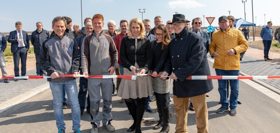Großes Foto: Freuten sich mit den Gästen und Geschäftspartnern über die neue Anbindung des Baugebiets „In den Weingärten“, vorne, von links: Bauleiter Ralf Gaß und Polier Daniel Hirmann, Knebel Baugesellschaft mbH, Oberbürgermeisterin Dr. Heike Kaster-Meurer, Aufsichtsratsvorsitzende der Gewobau Bad Kreuznach, Feodora Wolff vom Frankfurter Projektentwickler bpd und Karl-Heinz Seeger, Geschäftsführer der Gewobau Bad Kreuznach gaben den so genannten „Lückenschluss“ der Dürer Straße offiziell zum Befahren frei.