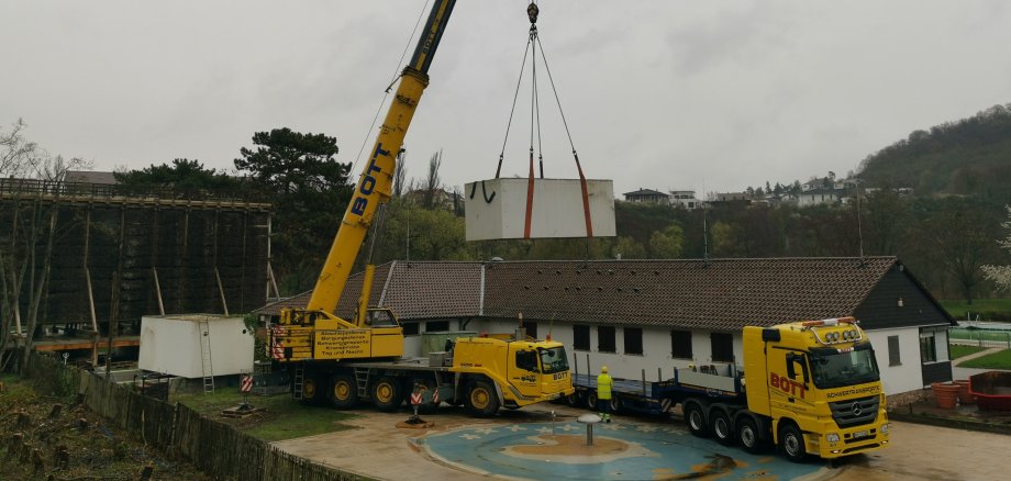 In den Garagen lagern Schwimmbadleinen, Werkzeug und weiteres Material, das für den Badbetrieb benötigt wird. Ab Anfang Mai wird bereits die neue Trafostation für die Energieversorgung errichtet und mit dem Beginn der Baustraßen-Herstellung werden auch die Versorgungsleitungen zum Bad erneuert.