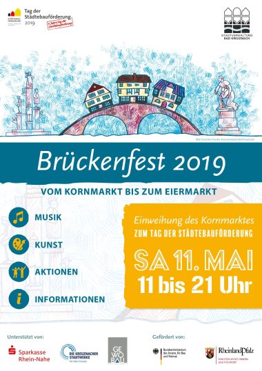Vom Kornmarkt führt für die Festmeile dann auf die Mühlenteichbrücke/Alte Nahebrücke. Dort lädt die Kunstwerkstatt zum Tag der offenen Tür ein. Franziska Dumke hat das schöne Brückenfestplakat entworfen, wofür sich Oberbürgermeisterin Kaster-Meurer herzlich bedankt. Auch Musik wird geboten: Ein Blechbläserensemble der Musikschule Mittlere Nahe spielt von 16 bis 17 Uhr. Am Nachmittag unterhält Josbert de Fries mit seiner Gitarre. Beim Weltladen auf der Nahebrücke heißt es von 11 bis 18 Uhr „40 Jahre Weltladen − Tag des Fairen Handels − MENSCH. MACHT. HANDEL: FAIR in den TAG“. Dazu gibt es einen kleinen Frühstückstisch mit Infos zu den Produkten. Eine Kinder-Modenschau zeigt das Bekleidungsgeschäft „Glücksmaus“ um 14.30 Uhr. Mit Infoständen auf der Nahebrücke ist das ZSL (Zentrum für Selbstbestimmtes Leben) und der VdK-Kreisverband Bad Kreuznach vertreten. Der Altstadtverein verwandelt ein Stück Alte Nahebrücke in eine grüne Oase.