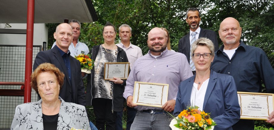 Foto: Bedankten sich für die Treue zum Jahrmarkt mit einer Urkunde: Jahrmarktsbürgermeister Markus Schlosser und Marktmeister Mathias Weyand (dritter von rechts) mit den Schaustellern (von links) Renate Mönnig, Carmen Bügler mit Familie, Johann Bügler (Sohn des verhinderten Friedrich Bügler) und Walter Roos mit Ehefrau.
