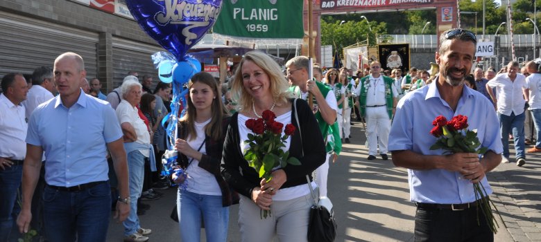 Auch die Naheweinkönigin Angelina Vogt und ihre Naheweinprinzessinnen Tina Haas und Annika Hohmann sowie die Bad Kreuznacher Bundeslandwirtschaftsministerin Julia Klöckner nahmen am Umzug über die Pfingstwiese teil ...