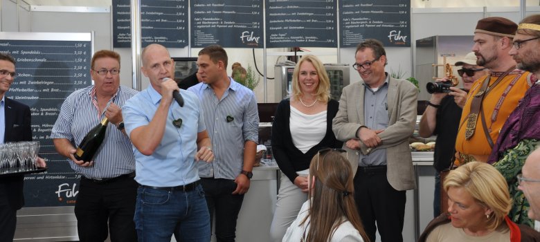 Während der von der Antenne Bad Kreuznach moderierten Eröffnungsfeier wurden die Gewinner des Preisausschreibens des Freundeskreises Kreiznacher Johrmarkt geehrt: Der 1. Preis ging an Ursula Weyand (karierte Bluse), der 2. an Inka Mund (links daneben in schwarz) und der 3. Preis an Arnulf Schödel (graues Hemd mit Brille).