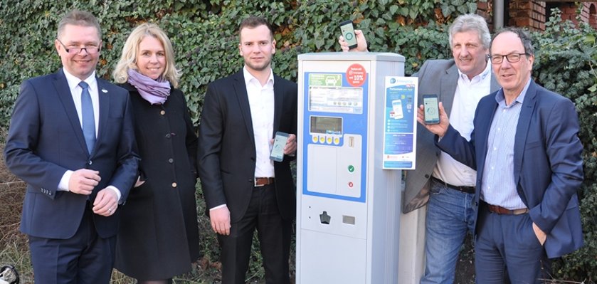 Auf dem Foto von links nach rechts: Stadtwerke-Geschäftsführer Christoph Nath, Oberbürgermeisterin Dr. Heike Kaster-Meurer, Fabian Grief (travipay), Helmut Kreis und Klaus-Dieter Dreesbach (beide Stadtwerke