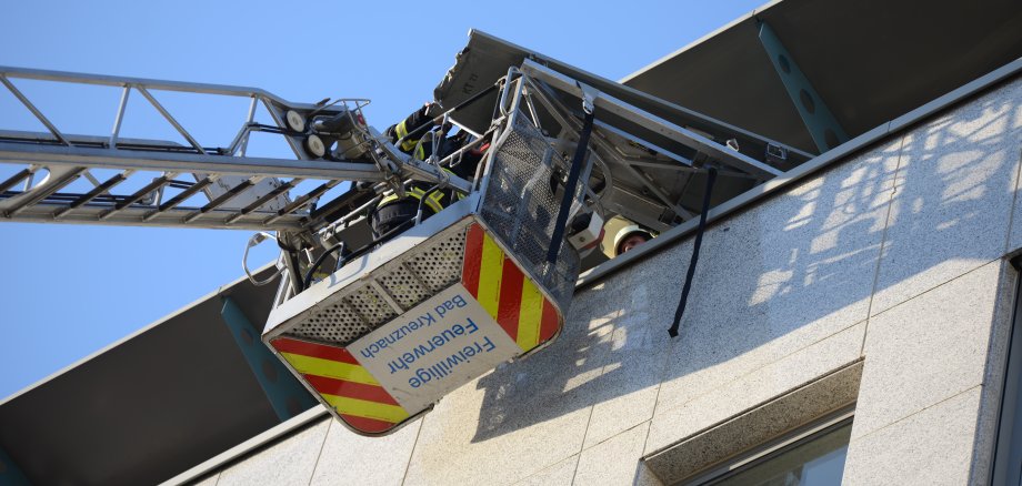 Die ersten angerückten Kräfte öffneten mit einem hydraulischen Türöffnungswerkzeug die Haupteingangstür, um in das Gebäude zu gelangen. Zwei Trupps unter Atemschutz gingen mit 2 C-Rohren zur Personenrettung und Brandbekämpfung über das Treppenhaus vor. Parallel wurde die Drehleiter in Stellung gebracht, um die beiden auf dem Dach befindlichen Personen zu retten. Die Person mit der Rückenverletzung musste schonend auf einer Trage auf der Tragehalterung am Korb der Drehleiter zu Boden gebracht werden. Dafür hatte sich Volksbankmitarbeiter Odo Steinmann (Vorstand Leitung Produktion/Steuerung) freiwillig gemeldet. Die Atemschutztrupps hatten nach und nach die vier Personen im Gebäude aufgespürt und ins Freie verbracht. Dabei wurden verschiedene Türöffnungsmethoden mit diversen Aufbruchswerkzeugen angewendet. Für eine Person kam jede Hilfe zu spät. Sie wurde in einer Schleifkorbtrage nach unten getragen. Die verrauchten Räumlichkeiten wurden mit einem Belüftungsgerät entraucht. Nach etwa einer Stunde hieß es dann Übungsende. An der Übung nahmen über 30 Feuerwehrleute mit insgesamt sieben Fahrzeugen des Löschbezirks Süd und der Freiwilligen Feuerwehr Hackenheim teil. Die Übungsleiter waren mit dem Ergebnis und der Zusammenarbeit der Wehrleute sehr zufrieden, besonders weil eine Außentemperatur von weit über 30°C vorherrschte und die Wehrleute besonders bei der Personenrettung unter Atemschutz in der Hitzeschutzbekleidung dadurch an ihr Limit gehen mussten. Odo Steinmann und Andreas Weber (Bauleiter der Firma Schoofs aus Frankfurt am Main) bedankte sich für den gezeigten Einsatz der Wehrleute und luden im Anschluss zu Kaltgetränken und Verpflegung ein. Auch die Übungsleiter und die Wehrleiterin Manuela Liebetanz bedankten sich beim Vorstand der Volksbank Rhein-Nahe-Hunsrück für die Möglichkeit in dem Objekt unter sehr realen Bedingungen üben zu können. Wo können sonst Türen zu Übungszwecken aufgebrochen werden? Und auch das will bei einem Realeinsatz geübt sein. Alexander Jodeleit, Pressewart der Freiwilligen Feuerwehr Bad Kreuznach |