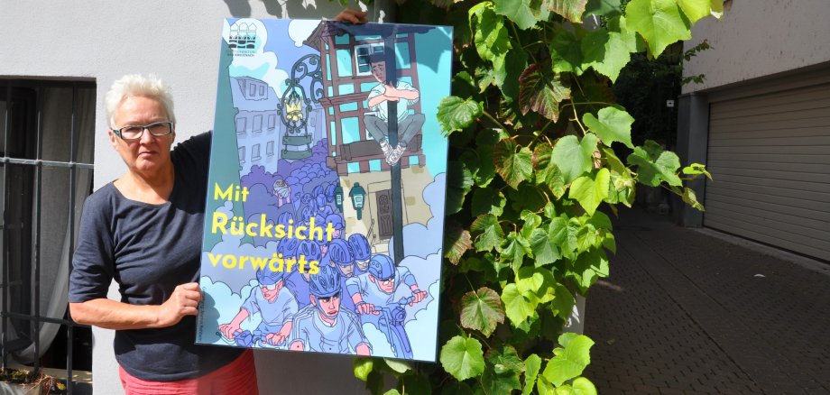 Oberbürgermeisterin Dr. Heike Kaster-Meurer hatte zu Beginn des Jahres diese Kampagne für faires Verhalten im Straßenverkehr gestartet. Zu diesem Zweck hatte Marius Rehbein, Student für Kommunikationsdesign an der Hochschule Mainz, drei Cartoons entworfen. Eines davon zeigt eine Horde von Radfahrern, die durch die Fußgängerzone rasen, als gelte es die Tour de Deutschland zu gewinnen, und einen Fußgänger, der gerade noch auf eine Straßenlaterne in der Nähe des Gasthauses Krone flüchten kann. Das Plakat hängt nun an der Hausecke in der Magister-Faust-Gasse 24. Christel Bittmann hofft, dass die gezeichnete Mahnung Radfahrer und Radfahrerinnen dazu bewegt, hier nur Schritttempo zu fahren, also „mit Rücksicht vorwärts.“